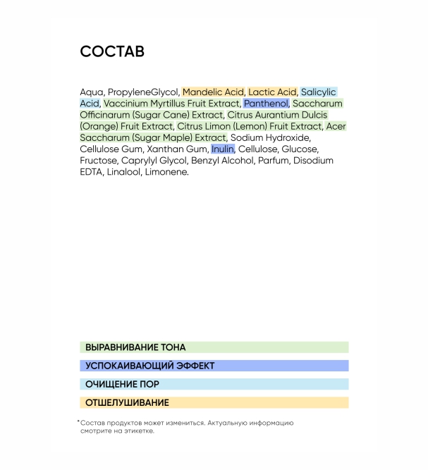 Aqua, Propylene Glycol, Mandelic Acid, Lactic Acid, Salicylic Acid, Vaccinium Myrtillus Fruit Extract, Panthenol, Saccharum Officinarum (Sugar Cane) Extract, Citrus Aurantium Dulcis (Orange) Fruit Extract, Citrus Limon (Lemon) Fruit Extract, Acer Saccharum (Sugar Maple) Extract, Sodium Hydroxide, Cellulose Gum, Xanthan Gum, Inulin, Cellulose, Glucose, Fructose, Caprylyl Glycol, Benzyl Alcohol, Parfum, Disodium EDTA, Linalool, Limonene.