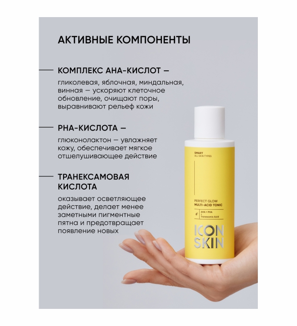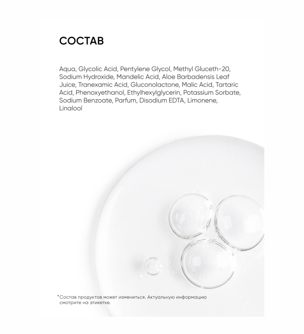 Комбинация кислот в формуле тщательно продумана: они не только дополняют, но и усиливают эффективность друг друга. AHA-комплекс (гликолевая, яблочная, миндальная и винная кислоты) ускоряет клеточное обновление, очищает поры, выравнивает рельеф кожи. Глюконолактон предотвращает обезвоживание, транексамовая кислота работает против пигментации и окислительного стресса, а гель алоэ вера увлажняет и успокаивает. В результате применения кожа становится более свежей, гладкой и сияющей, поры и следы акне — менее заметными.