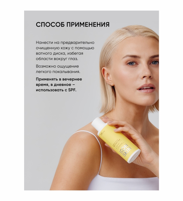 Нанести на предварительно очищенную кожу с помощью ватного диска, избегая области вокруг глаз. Возможно ощущение легкого покалывания. Применять в вечернее время, в дневное — использовать средства с SPF. Допускается выпадение осадка, перед применением взболтать. Состав: