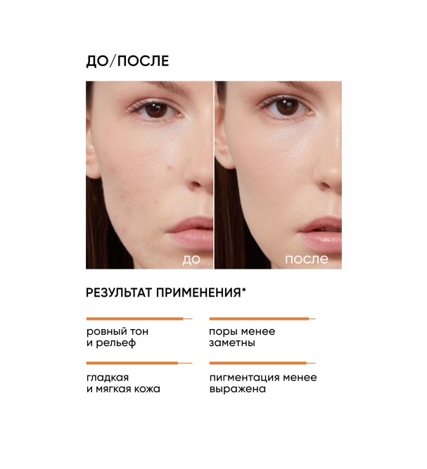 pH = 3,3 МГНОВЕННЫЙ РЕЗУЛЬТАТ: более ровный тон лица, гладкая и мягкая кожа.