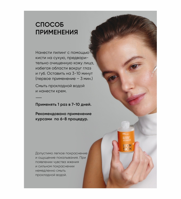 Нанести пилинг с помощью кисти на сухую, предварительно очищенную кожу лица, избегая области вокруг глаз и губ. Оставить на 3-10 минут; допустимо легкое покраснение и ощущение покалывания. Смыть прохладной водой.