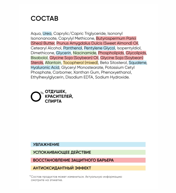 Aqua, Urea, Caprylic/Capric Triglyceride, Isononyl Isononanoate, Caprylyl Methicone, Butyrospermum Parkii (Shea) Butter, Prunus Amygdalus Dulcis (Sweet Almond) Oil, Cetearyl Alcohol, Panthenol, Pentylene Glycol, Isopentyldiol, Dimethicone, Glycerin, Niacinamide, Phospholipids, Glycolipids, Bisabolol, Glycine Soja (Soybean) Oil, Glycine Soja (Soybean) Sterols, Allantoin, Tocopherol (mixed), Beta Sitosterol, Squalene, Hyaluronic Acid, Glyceryl Monostearate, Potassium Cetyl Phosphate, Carbomer, Xanthan Gum, Phenoxyethanol, Ethylhexylglycerin, Disodium EDTA, Sodium Hydroxide.