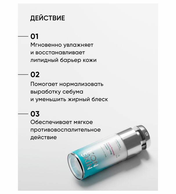 Крем обеспечивает длительное увлажнение кожи и оказывает себонормализующий эффект. На жирной коже помогает уменьшить гиперактивность сальных желез, не нарушая естественного защитного барьера. На комбинированной коже выравнивает гидролипидный дисбаланс: уменьшает сухость обезвоженных участков и убирает избыточный блеск в Т-зоне. Легкая текстура крема не перегружает кожу и быстро впитывается без ощущения липкости.