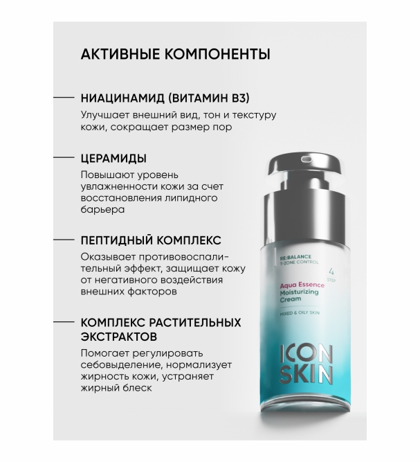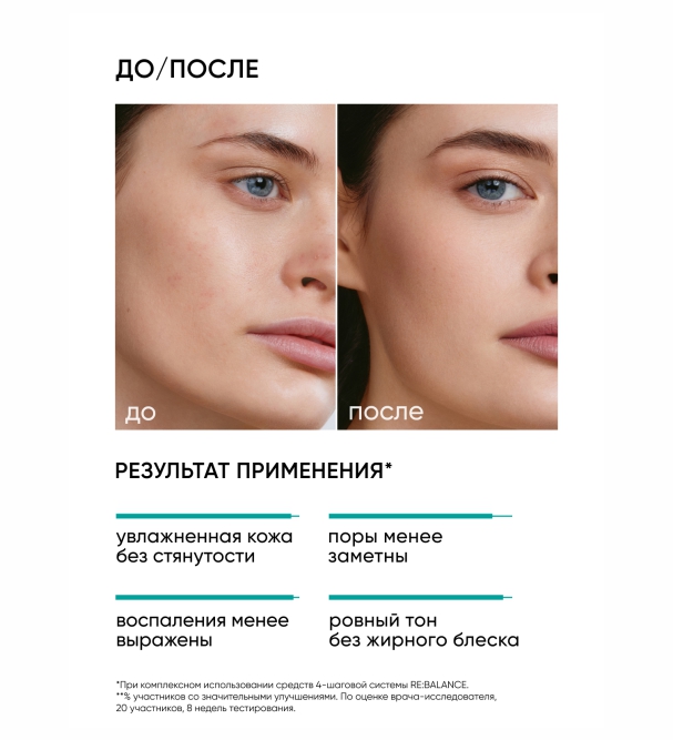 Ключевые ингредиенты формулы работают в комплексе и позволяют добиться состояния кожи, при котором она будет выглядеть свежей и здоровой — без избыточного жирного блеска и сухих участков, появившихся вследствие обезвоженности.