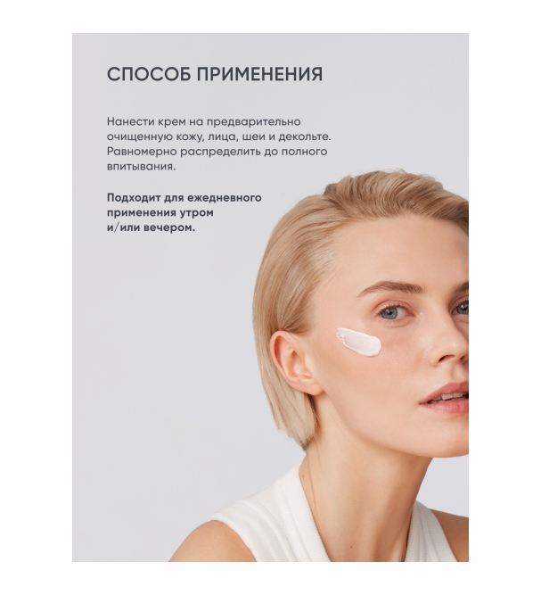 Нанести крем на предварительно очищенную кожу лица, шеи и зоны декольте. Равномерно распределить до полного впитывания.