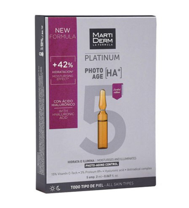 MartiDerm Platinum Photo-Age HA+ Ampoules — ампулы с легкой сывороткой, которая улучшает состояние кожи, защищает ее от фотостарения и загрязнений. Средство стимулирует синтез коллагена, благодаря чему повышается упругость, эластичность и уменьшается количество морщин. Активные ингредиенты: