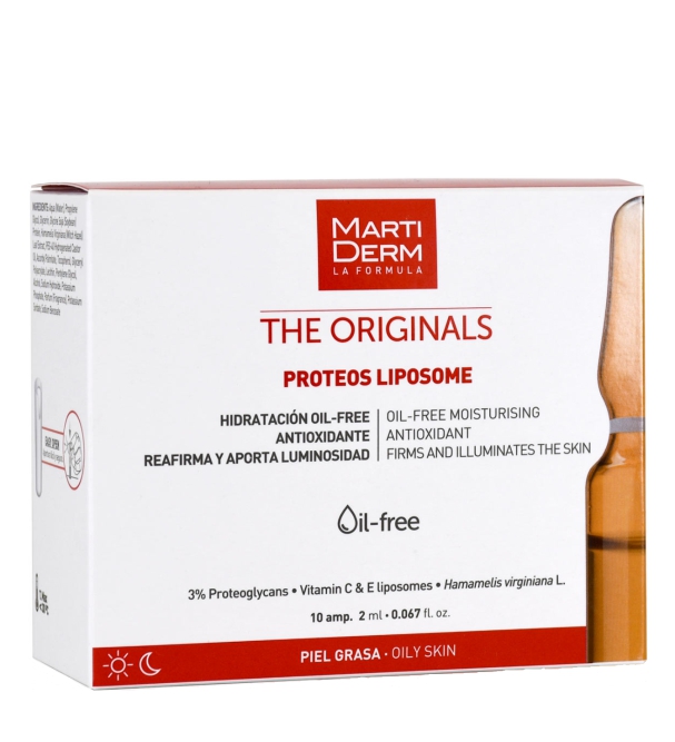 MartiDerm The Originals Proteos Liposome Ampoules Moisturizing and Firming — антивозрастной эликсир в ампулах. Насыщенная безмасляная сыворотка осветляет, увлажняет, укрепляет кожу, замедляет появление морщин, а уже существующие делает менее заметными. Также она защищает от вредной части спектра УФ-излучения. Активные ингредиенты: