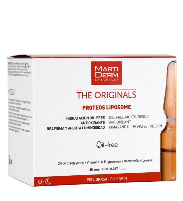 MartiDerm The Originals Proteos Liposome Ampoules Moisturizing and Firming — антивозрастной эликсир в ампулах. Насыщенная безмасляная сыворотка осветляет, увлажняет, укрепляет кожу, замедляет появление морщин, а уже существующие делает менее заметными. Также она защищает от вредной части спектра УФ-излучения. Активные ингредиенты: