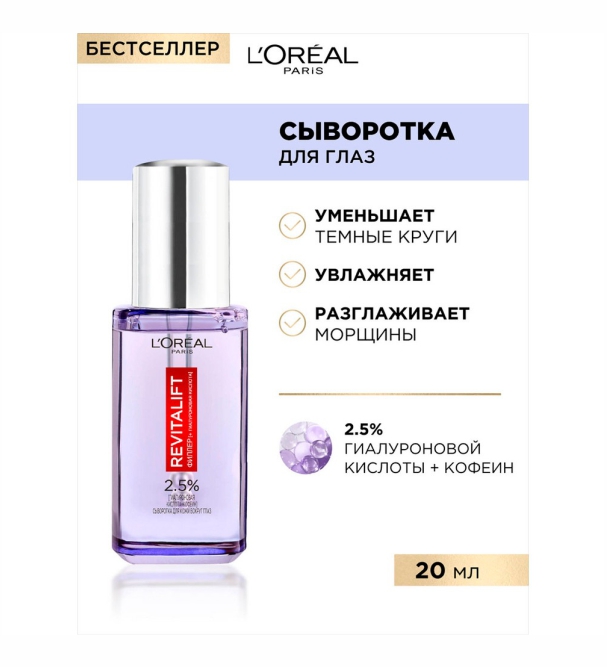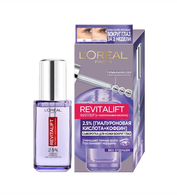 L'Oreal Paris Сыворотка для кожи вокруг глазРевиталифт Филлер, 2,5% Гиалуроновая кислота + Кофеин