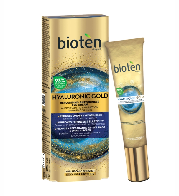 Восстанавливающий крем для области вокруг глаз против морщин BIOTEN Hyaluronic Gold с 93% ингредиентов натурального происхождения обеспечивает непревзойденную силу против морщин, чтобы восстановить естественную молодость вашей кожи. Гиалуроновый бустер содержит 3 вида гиалуроновой кислоты и 30 миллионов капсул гиалуроновой кислоты, восстанавливающих кожу. Протеины золота(полипептиды риса и горошка) увеличению синтез гиалуроновой кислоты, заполняют видимые морщины, уменьшают пигментные пятна и улучшают цвет лица. Крем уменьшает длину и глубину морщин, восстанавливает утраченный объем кожи, уменьшает темные круги и припухлость под глазами. Применение: