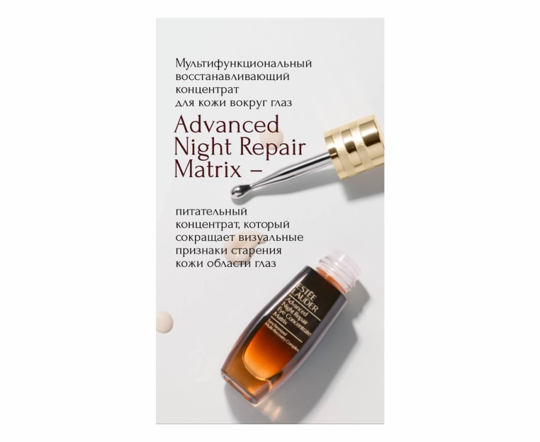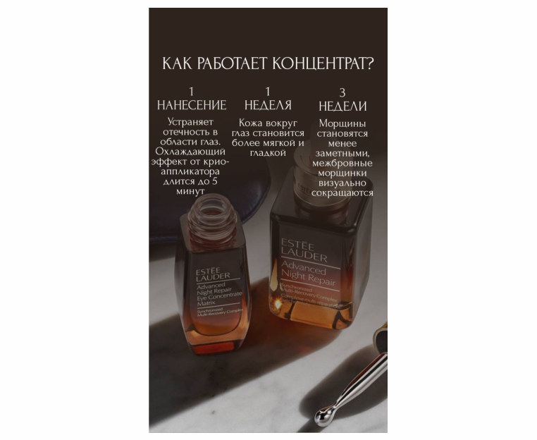 Питательный концентрат сокращает визуальные признаки старения всей кожи области глаз и борется сразу с несколькими проблемами: "гусиными лапками", межбровными морщинами, морщинками под глазами, потерей упругости кожи, отечностью и темными кругами.