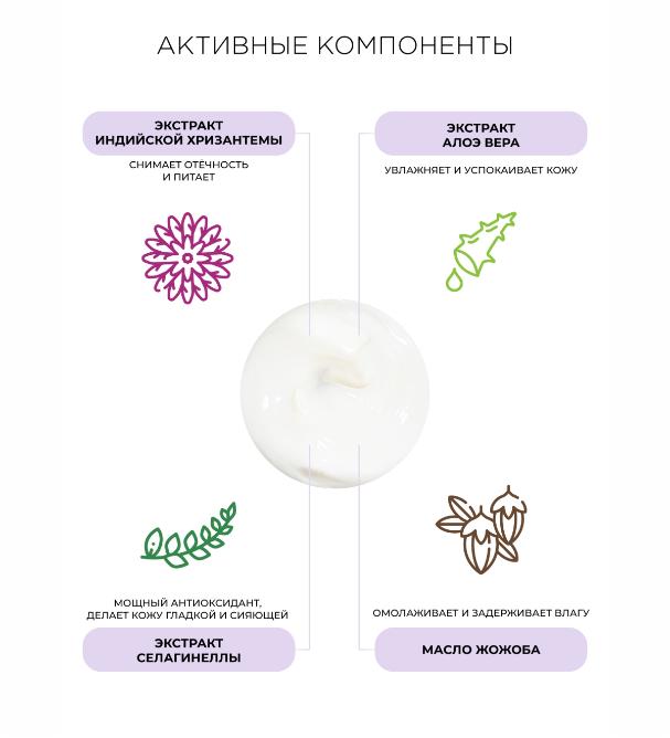 Богатый состав крема, включающий экстракты индийской хризантемы и селагинеллы тамарисины, увлажняет, защищает и восстанавливает нежную кожу вокруг глаз.