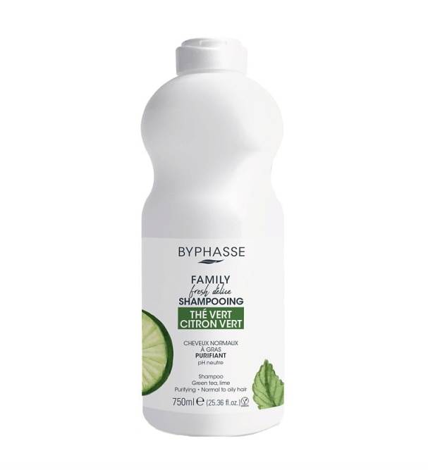 Шампунь для волос из новой линейки FAMILY FRESH DELICE от испанского бренда Byphasse - эффективно очищает, увлажняет и регенерирует волосы. Специально разработанная активная формула шампуня для волос возвращает к жизни поврежденные и тусклые волосы: восстанавливает их структуру, защищает, укрепляет и ускоряет рост. При регулярном использовании шампуня достигается долгий эффект чистых, свежих и шелковистых волос. Большой объем 750 мл и маленький расход позволит надолго забыть о покупке нового. Линейка состоит из 4 видов шампуней для разных типов волос, в которой каждый подберет уход для себя и семьи. - Шампунь с экстрактом зеленого чая и лайма – идеальное решение для нормальных и жирных волос. Экстракт лайма мягко очищает волосы и кожу, нормализует работу сальных желез, делая волос более мягким и эластичным. Зеленый чай обладает мощным антиоксидантным действием, глубоко увлажняет и восстанавливает волос. Обладает свежим цитрусово-травянистым ароматом. Нейтральный pH позволяет использовать шампунь всей семьей Применение: