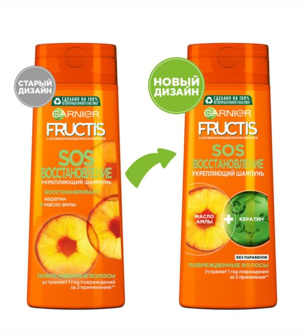 "Уникальная формула шампуня для волос Фруктис, обогащенная Керафилом и маслом Амлы, восстанавливает повреждения волос по всей длине, вызванные внешними воздействиями. Устраняет 1 год повреждений уже через 3 применения. В 10 раз более сильные волосы. Волосы более сильные, блестящие и шелковистые.