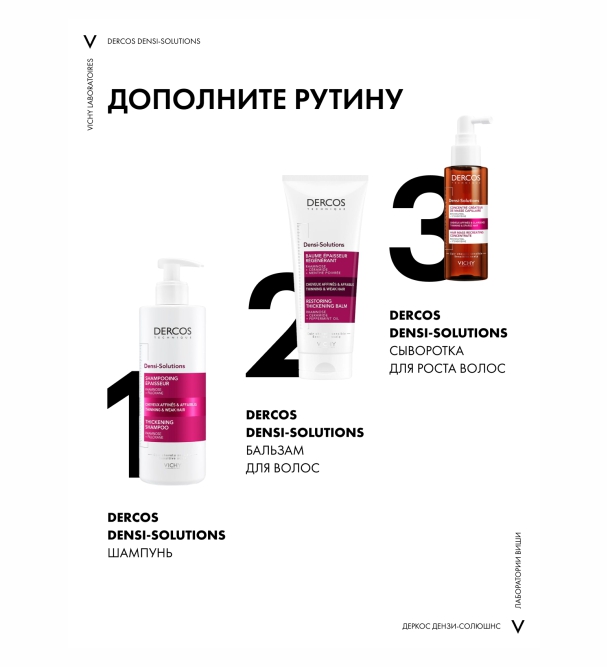 Наши волосы хранят в себе следы негативных воздействий, которым они когда-либо подвергались. Качество волос страдает как от внешних факторов горячей укладки, ультрафиолета, холода или неправильного ухода, так и от внутренних изменений, стресса, гормональных колебаний. Все это может привести к нарушению структуры волокна волоса, переходу части фолликулов в фазу покоя. Стержни волос истончаются, становятся менее прочными и упругими, в результате, прическа теряет объем и густоту. Верните лучшее время Ваших волос с DERCOS DENSI-SOLUTIONS. Эксперты Лабораторий VICHY разработали инновационную гамму средств по уходу за волосами, которая комплексно борется со всеми аспектами проблемы истончения волос. Сыворотка увеличивает количество волос, шампунь повышает их плотность, а бальзам восстанавливает структуру.