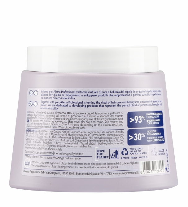 Светлые, седые или обесцвеченные волосы требуют постоянного ухода, чтобы их блики оставались чистыми и блестящими в течение длительного времени. Солнце, загрязнение, химическая обработка и укладка могут фактически изменить блеск, часто подчеркивая нежелательные желтые тона. Насыщенная формула на основе экстрактов винограда и протеинов шелка является настоящим природным антиоксидантом, полезным для укрепления и увлажнения волос.