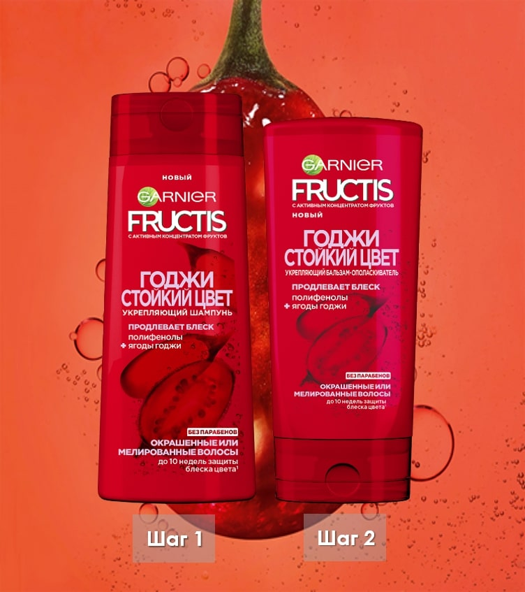Новая формула FRUCTIS не содержит парабенов и обогащена активным концентратом фруктов. Благодаря комбинации фруктов, витаминов В3, В6 и протеина лимона ваши волосы более сильные и блестящие. Уникальная формула FRUCTIS ГОДЖИ СТОЙКИЙ ЦВЕТ, обогащенная ягодами Годжи и полифенолами, питает и придает блеск окрашенным волосам. Результат: до 10 недель защиты блеска окрашенных волос. Формулы FRUCTIS эффективно и бережно ухаживают за вашими волосами. Подходит для ежедневного применения