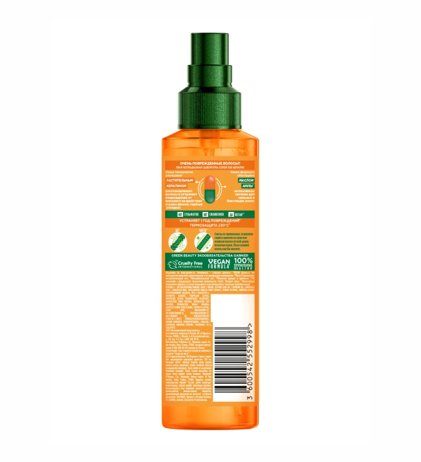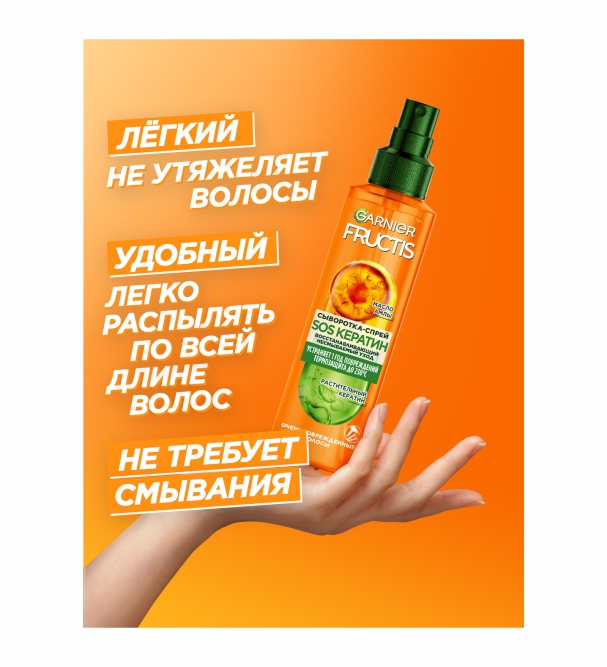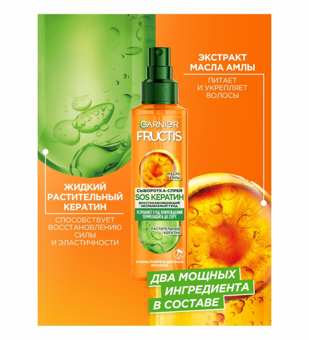 Читайте отзывы о Garnier SOS Кератин сыворотка-спрей на официальном сайте бренда. Результат: Питает и укрепляет. Обеспечивает термозащиту до 230°. Восстанавливает 1 год повреждений за 1 месяц применения. Назначение/Тип волос: Для всех типов, поврежденных, ослабленных, ломких Действие: Восстанавливает, питает, укрепляет Особенности: Восстанавливающий несмываемый уход с маслом амлы и растительным кератином Применение: