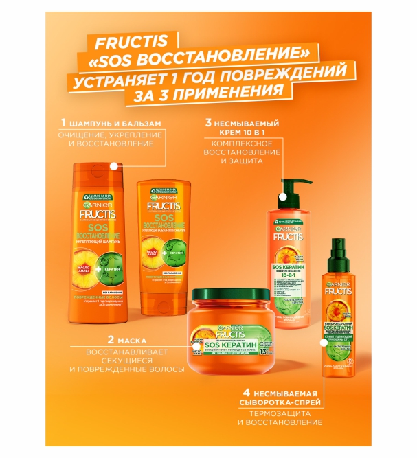 Для большей эффективности питательного ухода используйте шампунь и бальзам-ополаскиватель из гаммы Fructis SOS восстановление. Активные вещества: