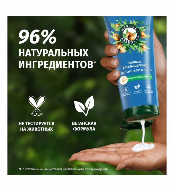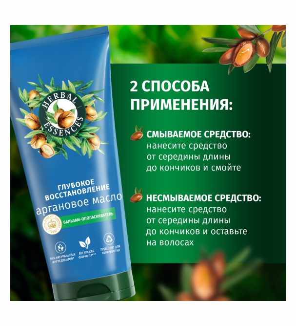 Наполните волосы энергией природы. Восстанавливающий бальзам-ополаскиватель Herbal Essences Аргановое масло Глубокое восстановление питает поврежденные волосы, делая их гладкими и блестящими, а насыщенный аромат средства зарядит вас энергией на весь день. Смесь растительных питательных нутриентов и аргановое масло подарят легкое расчесывание волосам и помогут восстановить повреждения. Уникальная технология бальзама-ополаскивателя позволяет использовать средство 2 способами: смываемое (нанесите от середины длины до кончиков, затем смойте) и несмываемое (нанесите от середины длины до кончиков и оставьте на волосах). Мы тщательно отбираем ингредиенты природного происхождения, чтобы привнести силу растений в вашу ванную комнату. Восстановите природную красоту волос и превратите уход за волосами в момент наслаждения вместе с коллекцией Аргановое масло Глубокое восстановление. Веганская формула. Область применения:
