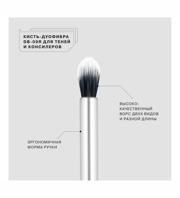 Форма профессиональной кисти "DB-09R" для нанесения и растушевки теней и консилеров от INFLUENCE BEAUTY произведена из ворса дуофибра и спроектирована таким образом, что разные по длине и плотности волоски создают тончайшее невесомое покрытие: нижний ворс кисти "DB-09R" тщательно распределяет продукт, а верхний его прекрасно растушевывает. Благодаря этому можно без усилий делать плавные естественные градиентные переходы от одного оттенка к другому.