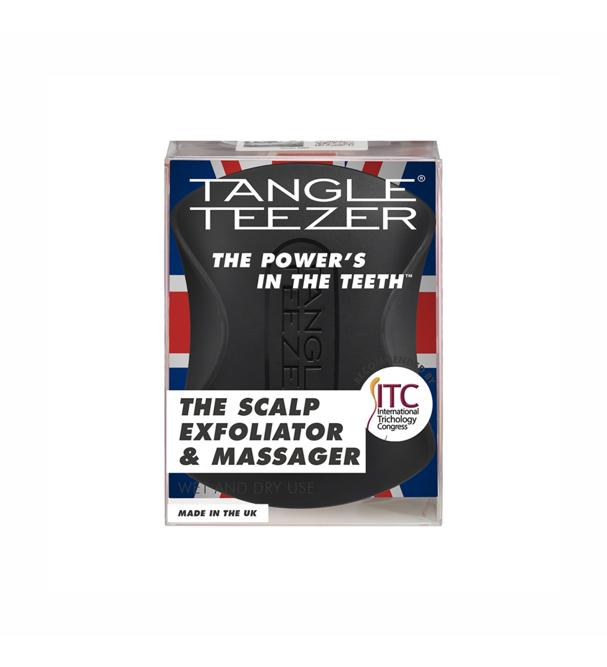 Tangle Teezer The Scalp Exfoliator and Massager Onyx Black — многофункциональная щетка для массажа головы в черном оттенке. Благодаря зубчикам двух размеров щетка выполняет сразу две функции: очищение и массаж. Длинные гибкие зубчики помогают очистить кожу головы, удаляя ороговевшие частицы кожи и оказывая мягкое отшелушивающее действие. Для интенсивного очищения используйте в паре с шампунем. Короткие плотные зубчики приятно массируют кожу головы, что снимает общее напряжение, а также способствует улучшению кровообращения и росту волос. Размер, форма и расположение зубчиков подобраны таким образом, что пряди не путаются во время использования щетки. Благодаря эргономичной форме и матовому покрытию щетку удобно держать в руке, и она не выскальзывает при контакте с водой. Подходит для применения на влажных и сухих волосах. Не предназначена для расчесывания волос, а также для использования на воспаленной и чувствительной коже. Не используйте с феном.