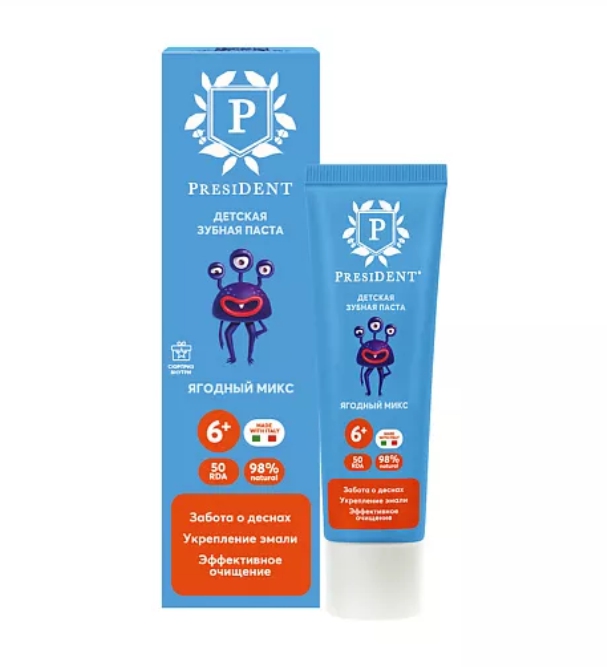 Детская зубная паста PRESIDENT® Ягодный микс 6+ (43 гр.) обеспечивает заботу о деснах, укрепление эмали и эффективное очищение.