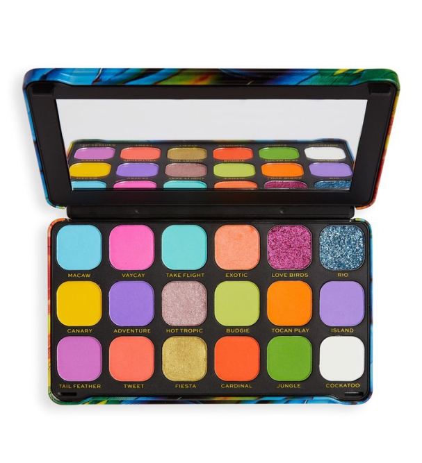Следующая остановка: тропики! Палетка теней для глаз от бренда REVOLUTION MAKEUP FOREVER FLAWLESS Bird of Paradise – это 18 высокопигментированных оттенка в жестяном футляре с ярким принтом оперения райских птиц.