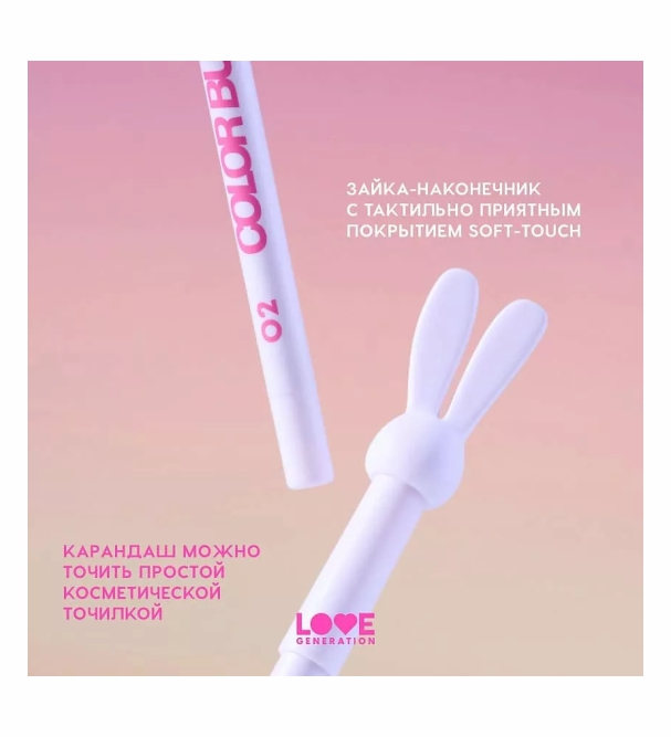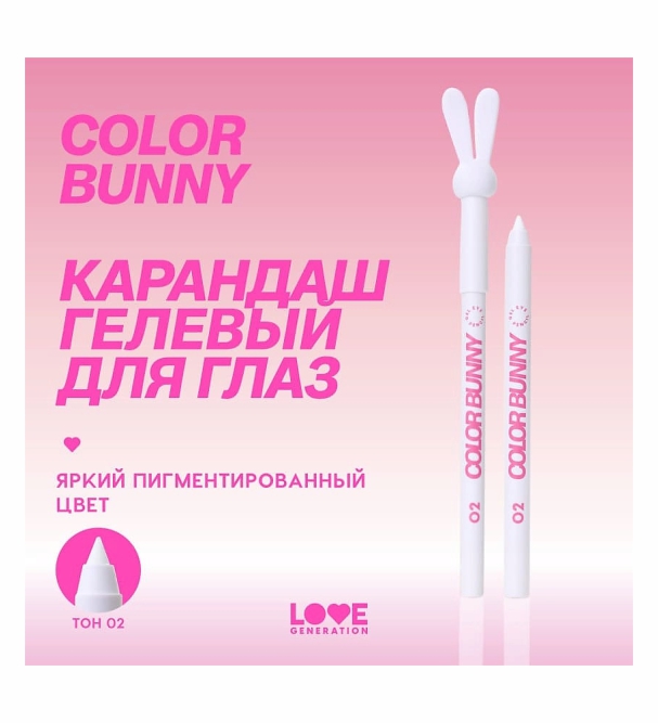 Самое время поднять себе настроение, создавая акценты на веке карандашом COLOR BUNNY. У него гелевая текстура, которая поможет сделать стойкий макияж глаз на весь день. Благодаря широкой палитре из 12 насыщенных пигментированных оттенков с матовым и сияющим финишем ты точно найдешь свой цвет. Способ применения: