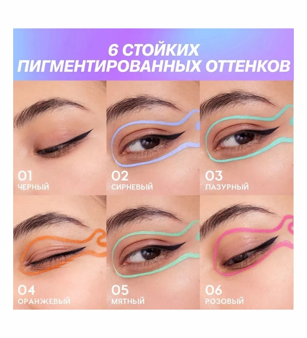 Нарисовала стрелки маркером COLOR RESOURSE, и уже в ресурсе! Выбирай, макияж с каким из шести оттенков отразит твой внутренний мир сегодня: черным, голубым, сиреневым, розовым, оранжевым или мятным. Маркером со стойкой пигментированной текстурой и фетровым аппликатором удобно выводить линии и расставлять акценты как на верхнем, так и на нижнем веке. Способ применения: