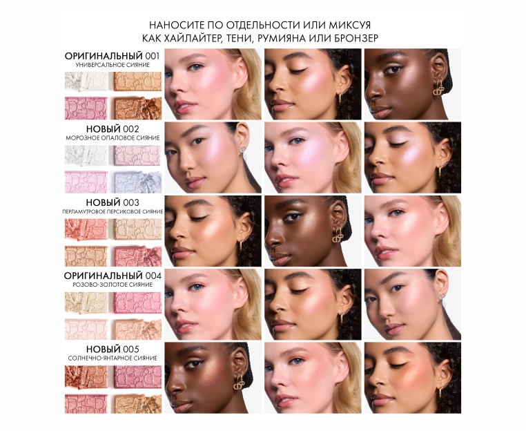 Широкая палитра оттенков, подходящих для любого тона кожи: от универсального 001 Универсальное Сияние до розово-золотых переливов 004 Розово-Золотое Сияние