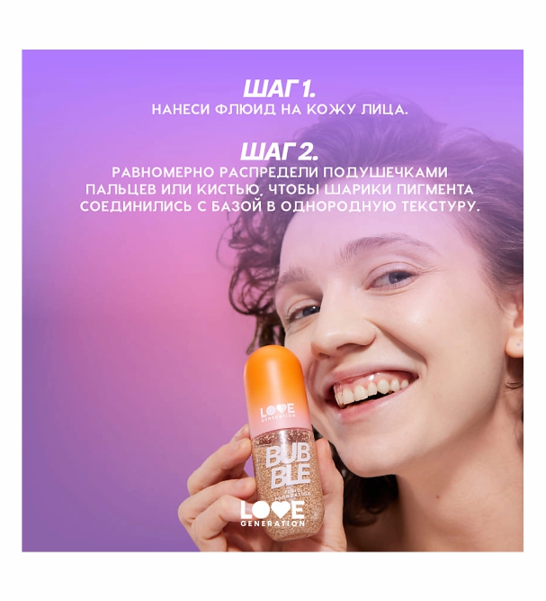 Иногда что-то привычное может приятно удивлять! Как тональное средство BUBBLE: это не просто продукт для ровного тона кожи, а невероятно легкий флюид с пузырьками для комфортного покрытия. У него жидкая текстура и милый флакончик обтекаемой формы с дозатором, с помощью которого ты легко наберешь нужное количество продукта. Выбирай свой из двух натуральных оттенков тонального флюида, который подходит для всех типов кожи. Способ применения: