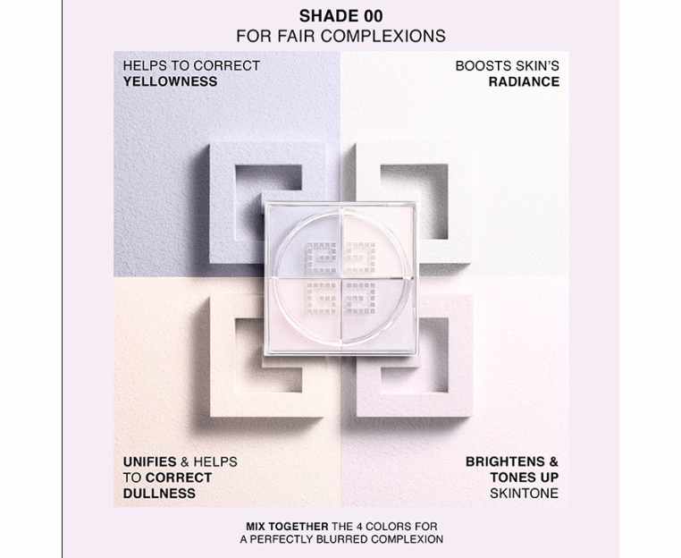 Легендарная рассыпчатая пудра Prisme Libre Givenchy имеет четыре оттенка для создания сияющей кожи: два корректирующих – слева, чтобы выровнять оттенок кожи и сделать ее более матовой, и два подсвечивающих – справа, чтобы создать однородный цвет кожи и усилить её сияние.