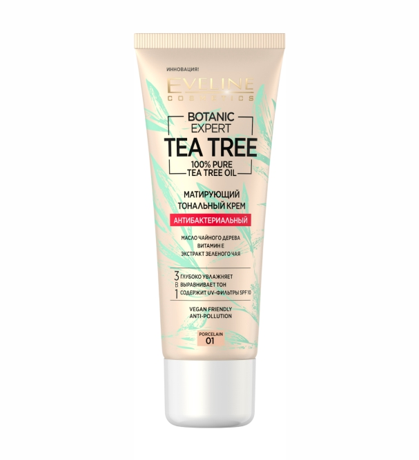 Содержащееся в тональной основе100% натуральное масло чайного дерева обладает антисептическими и себрегулирующими свойствами, очищает поры и придает коже здоровый бодрый вид.
