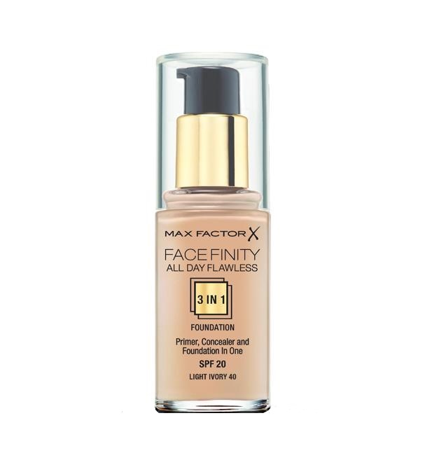 Max Factor Facefinity All Day Flawless 3 в 1 — это жидкая тональная основа, сочетающая в себе праймер и консилер, которая создаёт стойкое и безупречное покрытие. Улучшенная эмульсия на основе воды и силикона обеспечивает качественное покрытие и легко наносится благодаря специальной формуле, поэтому теперь сделать профессиональный макияж очень просто. Праймер выравнивает поверхность кожи и обеспечивает стойкость макияжа, а консилер маскирует недостатки и изъяны, придавая лицу безупречный вид. Формула Max Factor Facefinity очень лёгкая, предотвращает появление жирного блеска, поскольку в состав не входят масла, имеет солнцезащитный фактор SPF 20 для защиты кожи от солнечных лучей.