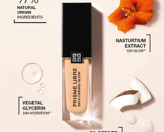 97% ингредиентов натурального происхождения* подарят совершенство и увлажнение Вашей коже в течение 24 часов. Тональное средство, обеспечивающее уход за кожей: увлажнение и безупречное покрытие сочетаются в одной формуле, усиливающей сияние. Givenchy использует 30-летний опыт по приданию сияния коже лица для создания первого тонального средства по уходу за кожей из коллекции Prisme Libre. Содержащее в составе 97% ингредиентов натурального происхождения, оно день за днем ухаживает за кожей, мгновенно придавая ей естественную красоту и сияние.