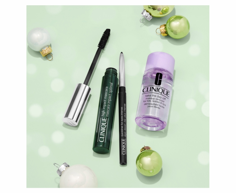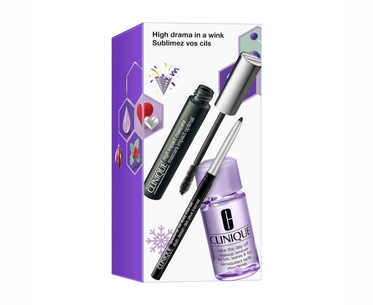 Универсальная тушь для ресниц Clinique High Impact Mascara - Black, Автоматический карандаш для век Clinique Quickliner For Eyes Intense - Intense Black, Средство для снятия стойкого макияжа с век, ресниц и губ Clinique Take The Day Off Makeup Remover For Lids, Lashes & Lips