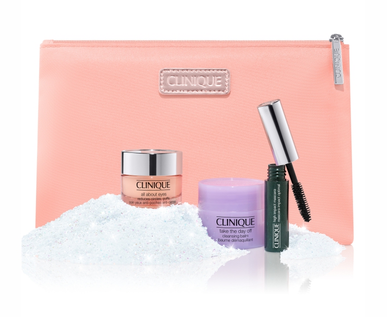 Крем-гель для ухода за кожей вокруг глаз Clinique All About Eyes; Универсальная тушь для ресниц Clinique High Impact Mascara; Бальзам для снятия макияжа Clinique Take The Day Off Cleansing Balm; Косметичка, 100% полиэстер, размер, мм: 216 х 64 х 140