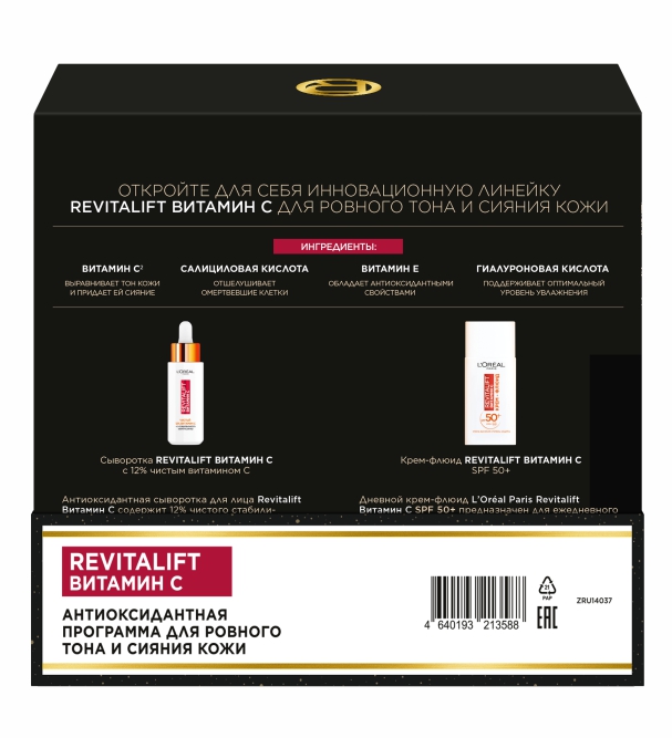 Набор L'Oreal Paris "Антиоксидантная Программа для Ровного Тона и Сияния Кожи": Revitfalift Витамин С Сыворотка + Крем-Флюид СПФ50+ 1.Revitalift Vitamin C Сыворотка: Используйте ваше обычное средство для умывания. Нанесите 2-3 капли сыворотки на зону лица, шеи и декольте, избегая области вокруг глаз. Наносите утром и вечером, утром используйте средство с SPF не менее 20. 2. Revitalift Vitamin C Крем-флюид: Используйте ежедневно в качестве основного ухода или в дополнение к вашему обычному уходу, а также перед нанесением макияжа. Перед применением хорошо встряхните средство. Возможно использование продукта в области вокруг глаз.
