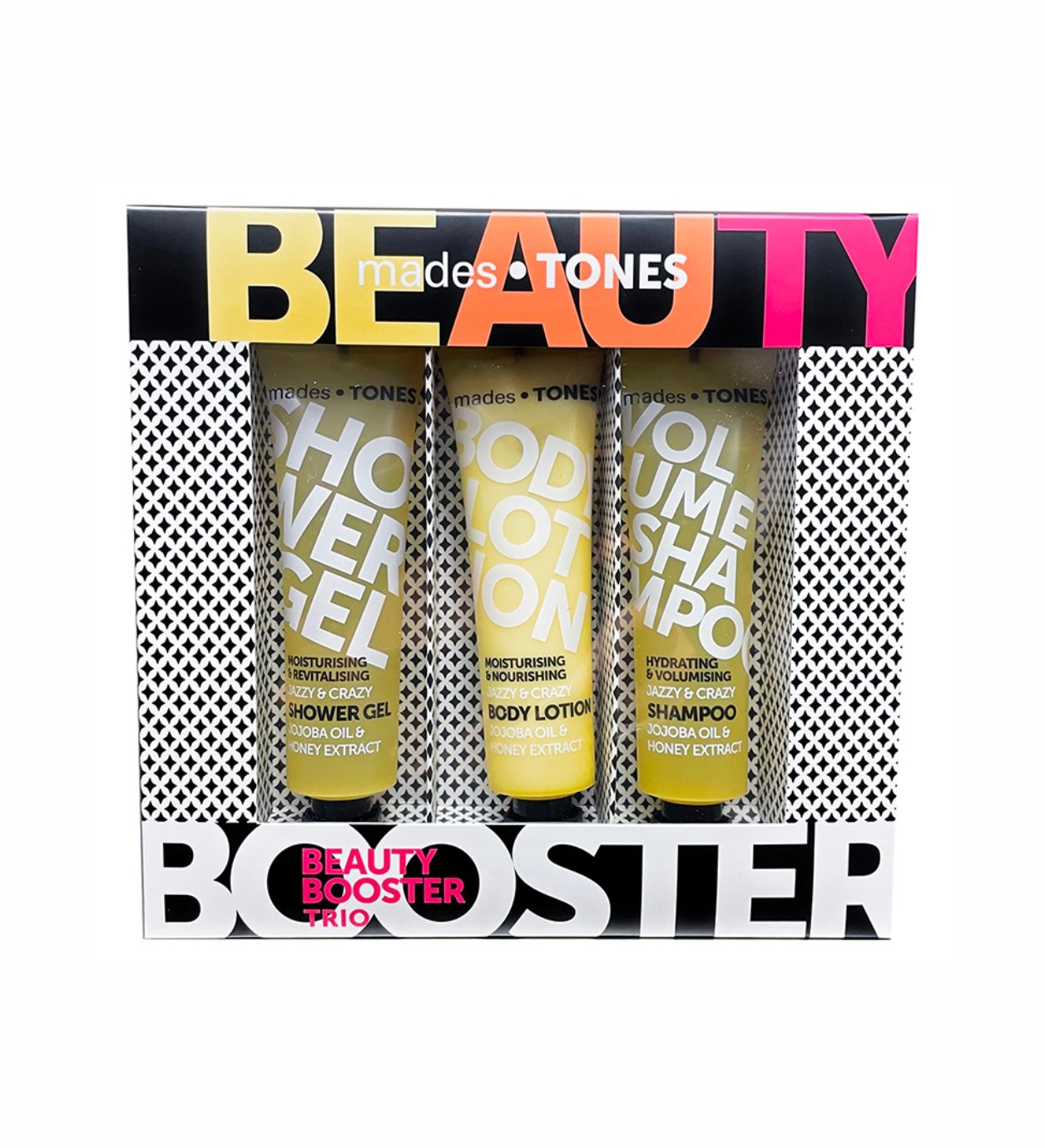 Mades Tones/ «jazzy & crazy» подарочный набор-трио (17x20x3.5 см) *гель для душа, 65 мл * лосьон для тела, 65 мл * шампунь для волос, 65 мл . Желтого цвета. С маслом жожоба и экстрактом меда. Игристый аромат.