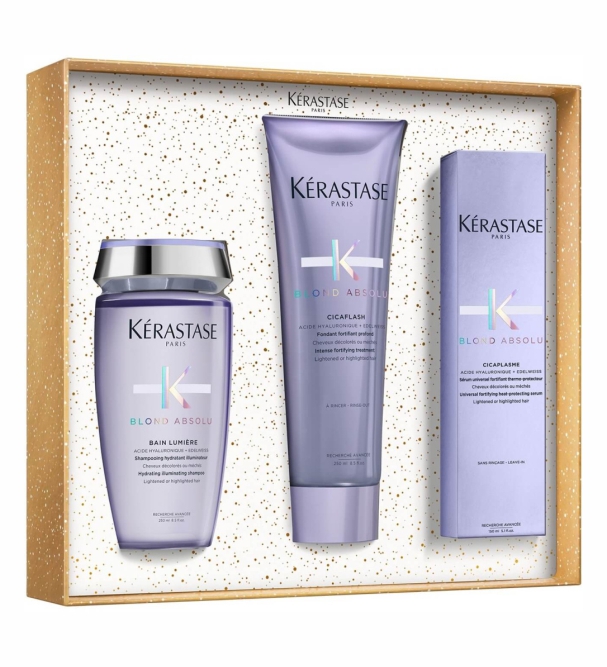 Kérastase Blond Absolu Fondant Holiday x3 / Подарочный набор ( 250 мл+200 мл+150 мл) Kérastase Blond Absolu Fondant Holiday — идеальный набор для знакомства с линейкой Blond Absolu или прекрасный подарок для обладательниц светлых волос. Этот набор, обогащенный экстрактом эдельвейса и гиалуроновой кислотой, обеспечивает сияние, здоровье и блеск светлых волос.
