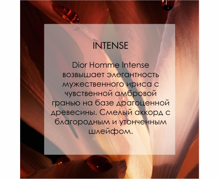 "Dior Homme Intense - глубокий восточный аромат. Насыщенные мягкие ноты с древесным акцентом придают парфюмерной композиции сухое звучание. В этом есть нечто невероятно мужественное".
