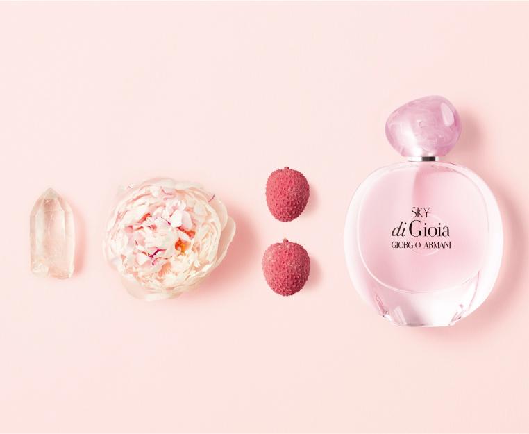 Создавая аромат SKY di Gioia, парфюмеры обратились к богатым традициям парфюмерного Дома Armani и воплотила дух небесной стихии в деликатной композиции, в сердце которой скрыта свежесть столистной розы. Аромат этого цветка Мари Саламан подчеркнула искрящимися верхними нотами сочного личи и хрустящей зеленой груши, которые озаряют всю композицию, словно яркий луч солнца. Роскошные бархатные аккорды пиона окутывают розу, покрытую солеными брызгами акватического Transluzone. Насыщенный и чувственный абсолю розы, дополнивший композицию, раскрывается изысканным и деликатным ароматом нежного розового бутона. Гельветолид с оттенком белого мускуса обрамляет композицию нотами почек черной смородины, а оттенки ежевики венчают эту симфонию женственности и счастья. Флакон SKY DI GIOIA, округлый и гладкий, как морская галька, выполнен из чистого стекла едва уловимого розового оттенка, в который окрашивается предрассветное небо над Средиземным морем. Колпачок флакона имеет чуть более насыщенный розовый цвет плода личи.