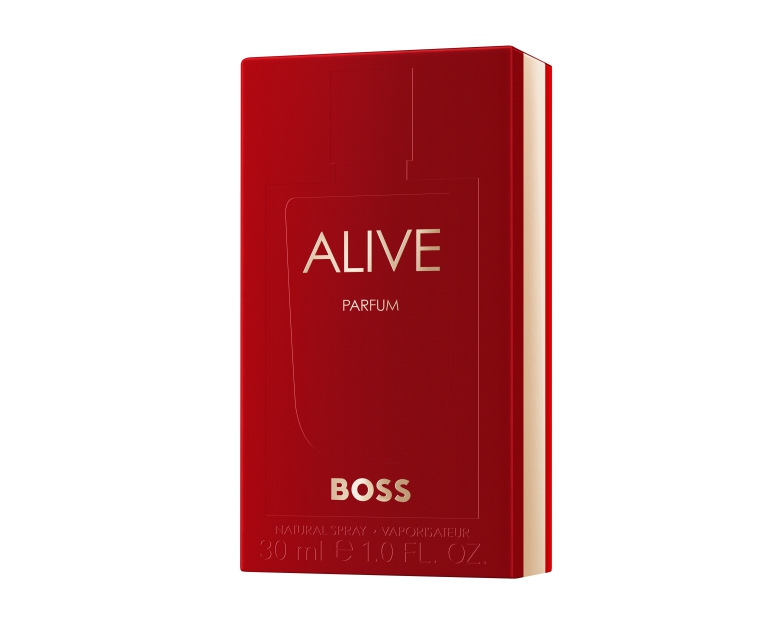 Стеклянный флакон окружен золотым орнаментом, а богатая рубиново-красная отделка олицетворяет дух женщины BOSS ALIVE.