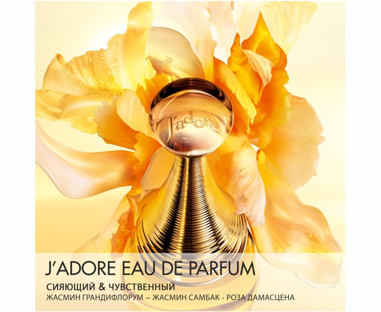 J'adore парфюмерлік суы — әйелдерге арналған таңғажайып гүлді хош иіс. Бұл хош иіс шоғыры ең соңғы бөлшегіне дейін керемет қайталанбас гүл ретінде ойлап шығарылды. Иланг-иланг эссенциясының гүлді-жемісті ноталары ашылады. Сән-салтанатты Дамаск раушаны сезімдерді оятады, ал Грас ақжұпары грандифлорум мен Самбак ақжұпарының үйлесімді дуэті де өз үлесін қосады.