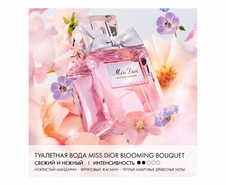 Miss Dior Blooming Bouquet иіссуы сезімтал да нәзік гүлді жанасу ретінде жасап шығарылды. Бұл — жаңа гүл жарған сан қырлы әрі қайталанбас гүл шоғыры. Оның қайшылыққа толы шлейфі қыр гүлдері мен бергамоттың ноталарымен берілген бір көргеннен ғашық болуға ұқсас сезім тудырады.