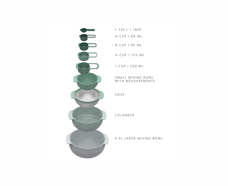 но функциональность и стиль тоже важны, на помощь приходит уникальный набор мисок и мерных емкостей Nest 9 Plus от английской компании Joseph Joseph. Яркий, современный, невероятно практичный, сделанный по самым новым технологиям из материалов,