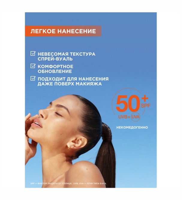 Солнцезащитный спрей-вуаль для лица SPF 50+ обогащен комплексом антиоксидантов: [витамин С* + витамин Е] и может наноситься поверх макияжа. Он способствует защите от пигментных пятен и возрастных изменений, вызванных солнцем благодаря очень высокой степени защиты SPF 50+.