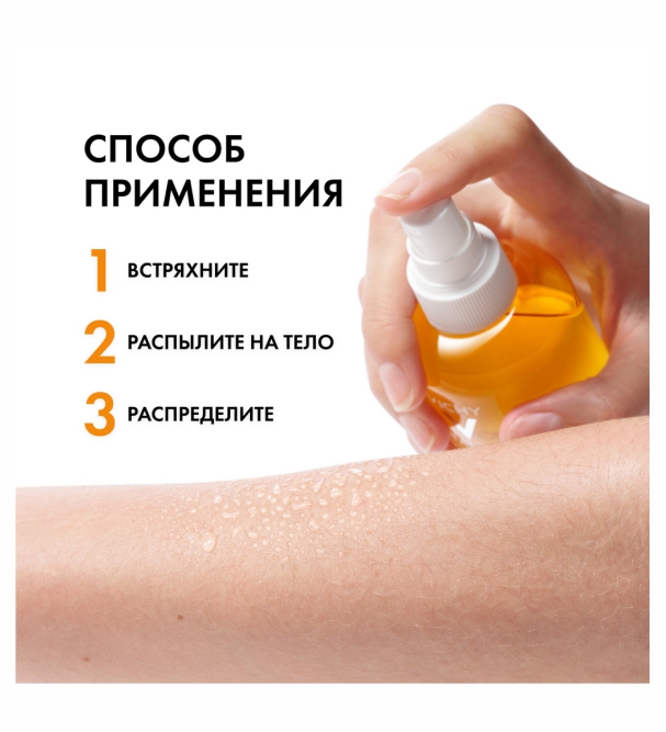 Хорошо встряхните перед использованием, распылите средство на тело и распределите руками. Наносите непосредственно перед выходом на солнце.