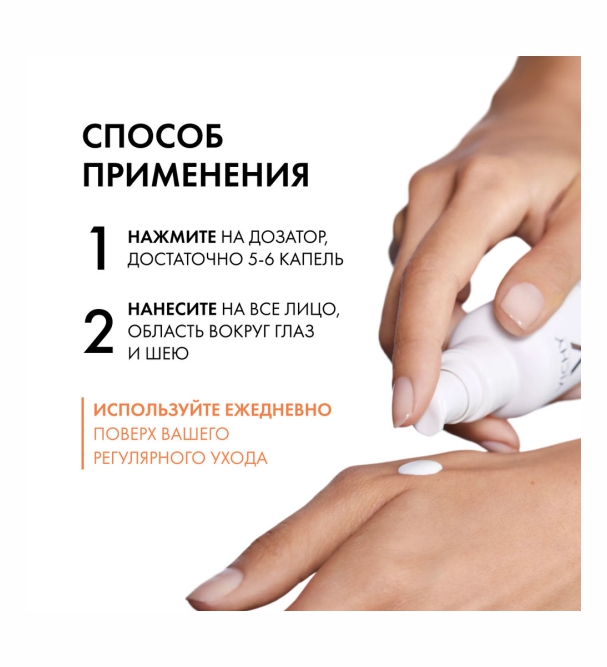 Нажмите на дозатор, выдавите 5-6 капель средства и нанесите на лицо и шею. Используйте ежедневно поверх вашего регулярного ухода.